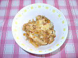 《作り方》 ① マカロニは、塩を加えた湯でかためにゆでる。 ② 野菜はみじん切りにする。 ③ 厚手の鍋を弱火にかけて、Aのバター・油を入れこがさな いように溶かし、小麦粉を振り入れ炒める。こんがりと色 づきトロッとするまでよく炒めブラウンルウを作る。 ④ 別の鍋に油を熱し、セロリ・しょうが・にんにくを炒める。 豚肉・ナツメグを加え、ぽろぽろになるまで炒める。さら にたまねぎ・にんじんも入れてよく炒め、スライスした マッシュルーム・スープを入れて煮る。 ⑤ Bの調味料を入れて味をととのえる。 ⑥ 細かくしたチーズとブラウンルウを入れ、弱火で煮込み、 ①のパスタを加え、赤ワイン・パセリを入れる。 ⑦ 耐熱皿にグラタンを入れ、モッツァレラチーズと粉チーズ を振りかけて、200℃のオーブンで15~20分こんが りと焼き色がつくまで焼き上げる。 ※ これは、家庭のグラタン皿に合わせた分量です。 給食は、この量より少なくなっています。 ※ 給食では鶏がらなどのスープを使用しています。 |