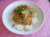 トウバンジャンを使って、ピリカラに仕上げた丼です。 鶏肉だけでなく厚揚げも使っているのでヘルシーです。 また、たけのこ・にんじん・たまねぎなどの野菜もたっ ぷり使っているので、「食物せんい」をしっかりとること ができます。 |